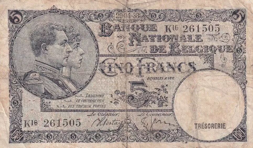 Billet Belgique 5 Francs - Albert & Elizabeth - 05-05-1938