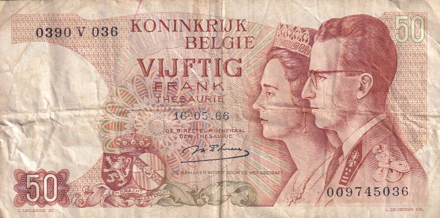 Au recto, le billet présente un portrait du Roi Baudouin et de la Reine Fabiola. Les inscriptions en langue latine comprennent le texte "KONINKRIJK BELGIE", signifiant "Royaume de Belgique", suivi de "VIJFTIG FRANK", indiquant la valeur de cinquante francs. La date d'émission, "16.05.66", est également mentionnée. On y trouve également la mention "DE DIRECTEUR-GENERAAL DER THESAURIE" ainsi que l'avertissement légal "DE NAMAKER WORDT DOOR DE WET GESTRAFT", signifiant que la contrefaçon est punie par la loi. La valeur faciale "50" est répétée, et les noms des graveurs et dessinateurs, "C. LECLERCQZ SC. L. DE DECKER DEL", sont inscrits.