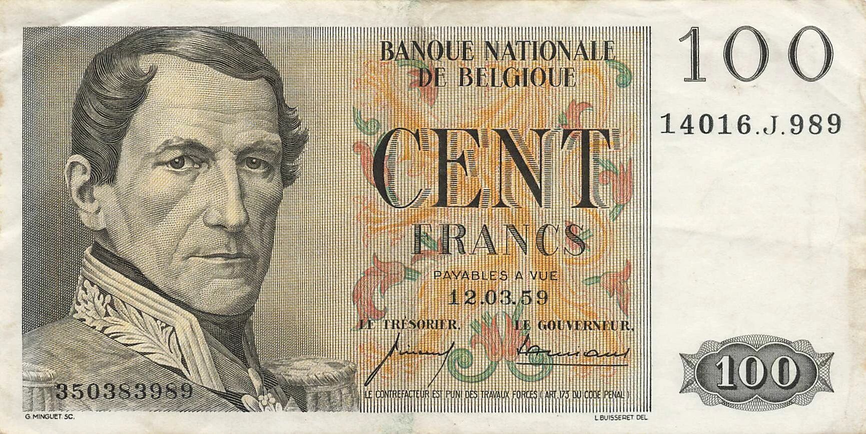 Home > World Banknotes > European Banknotes > Belgium > Belgium 100 Francs - 12-03-1959 - P.129