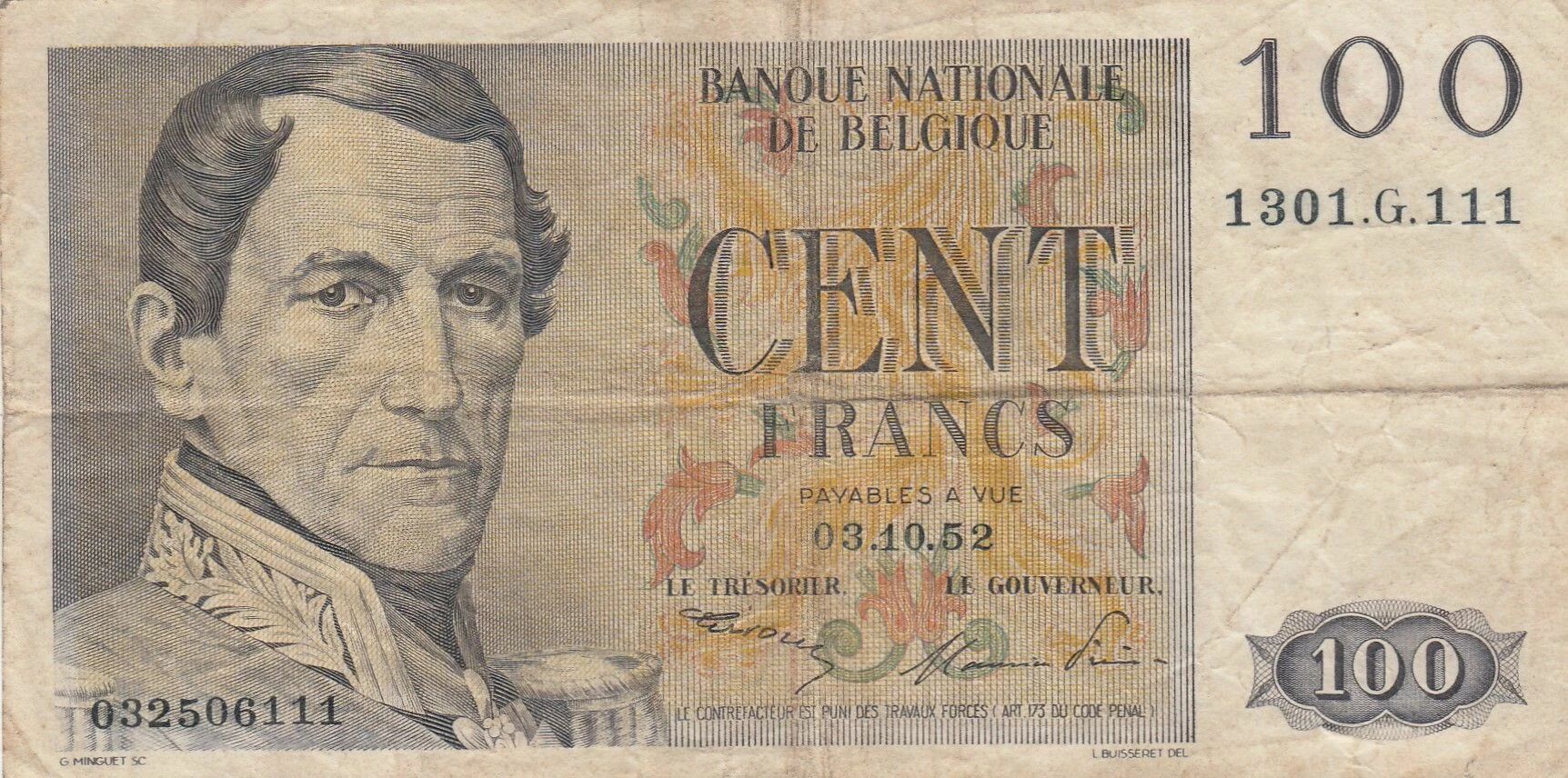 The 100 Francs banknote, issued by the National Bank of Belgium in 1952, is a testament to the iconography and prominent figures in Belgian history. This banknote belongs to the G series and features significant portraits on both sides.