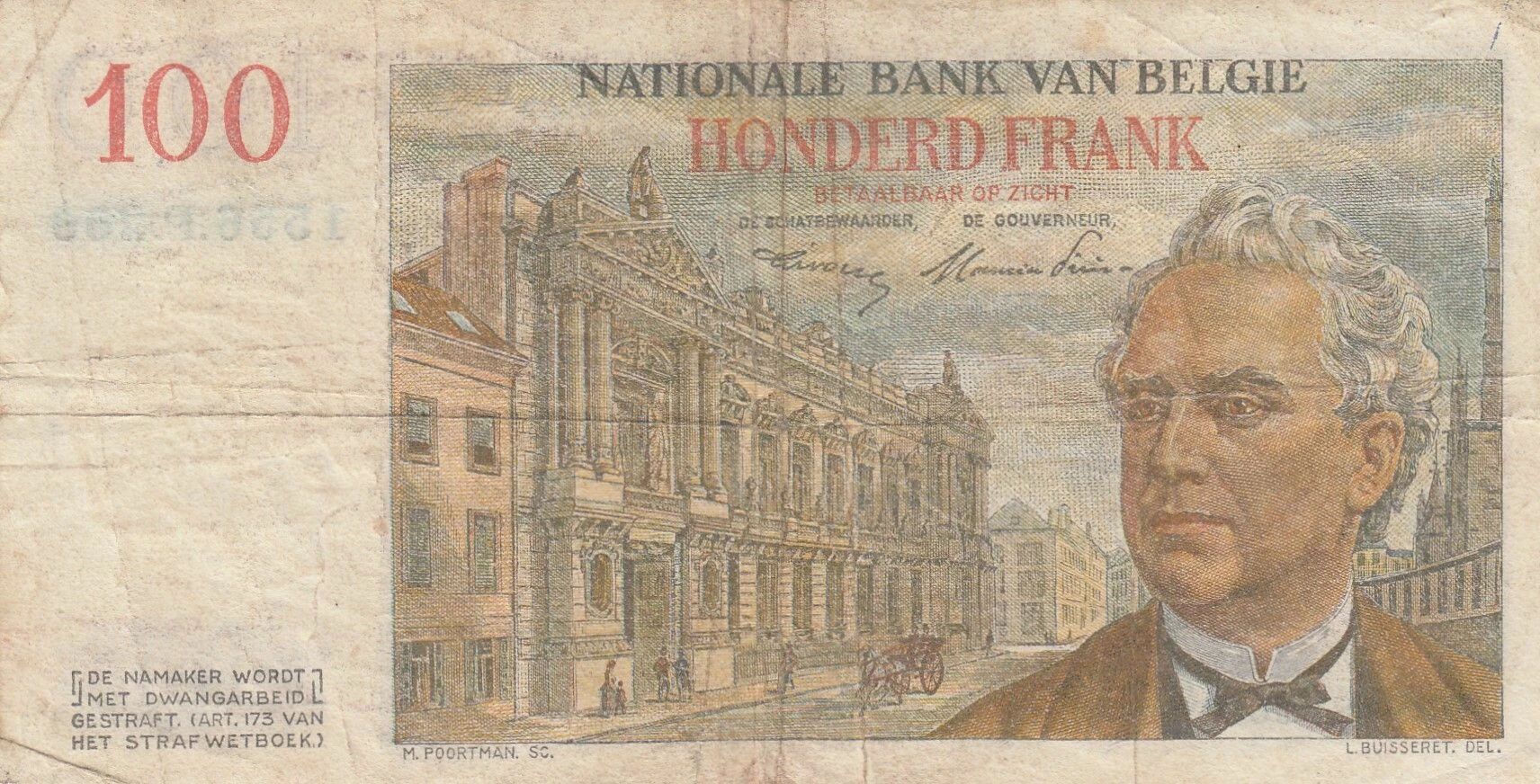 This banknote comes from Belgium and was issued in 1952. It is a 100 franc note, belonging to the P series. The note weighs one gram and its dimensions are 142 mm in length by 74 mm in width.
