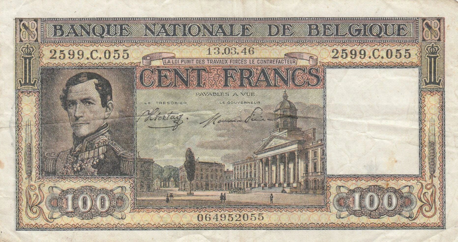 This Belgian banknote was issued in 1946. It has a face value of 100 francs.