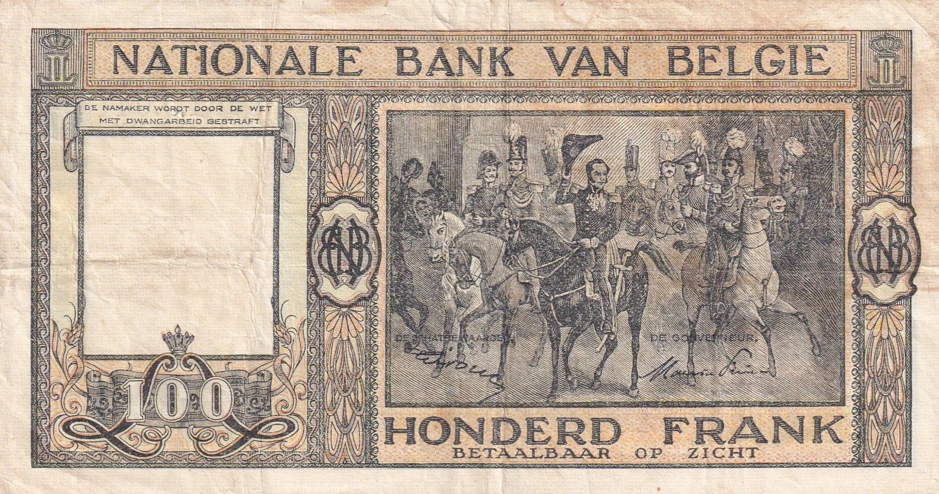 On the reverse, the banknote features a symbolic composition highlighting the theme of mounted troops. Decorative and ornamental elements complete the design, incorporating intricate motifs and careful details. The face value, "100 FRANK", is repeated in both national languages. The name of the issuing bank, in Dutch "NATIONALE BANK VAN BELGIE", is also indicated.