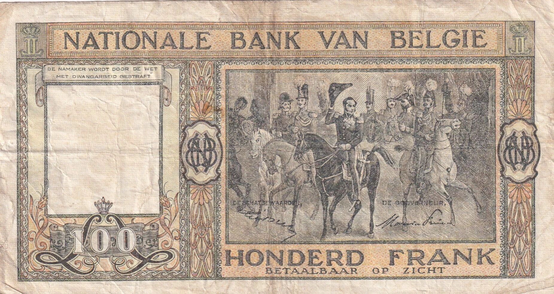 This Belgian banknote was issued in 1949. It represents a nominal value of 100 francs.