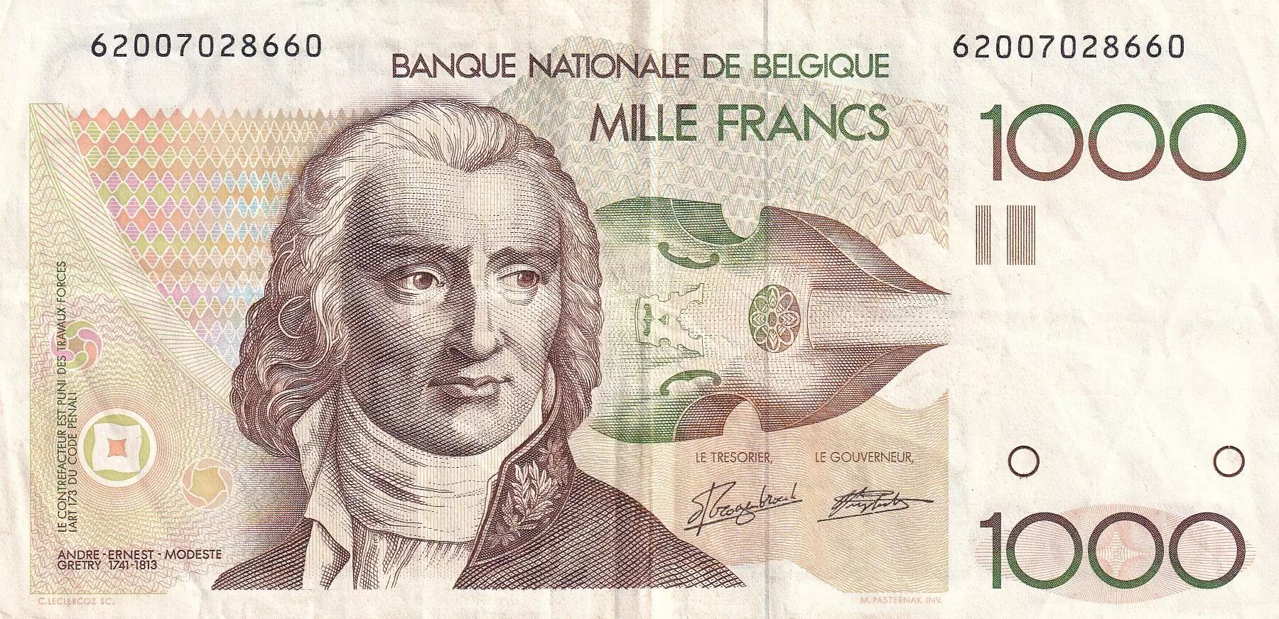 Home > World Banknotes > European Banknotes > Belgium > Belgium 1000 Francs - Andre Ernest Modeste Gretry - ND (1980-1996) - P.144a