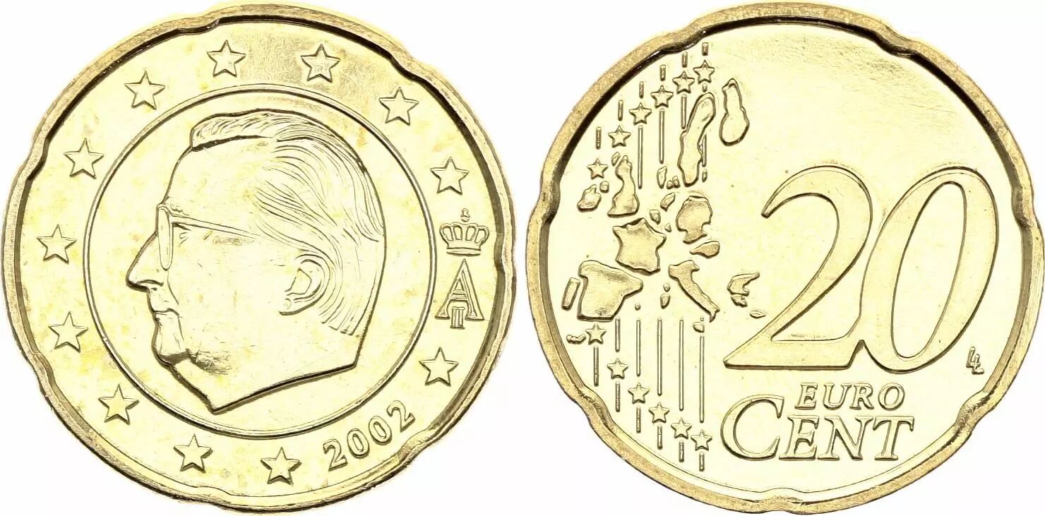 This coin is issued by Belgium and has a face value of 20 euro cents. The coin is made of Nordic gold, an alloy of copper, aluminum, zinc, and tin, which gives it its yellow color.