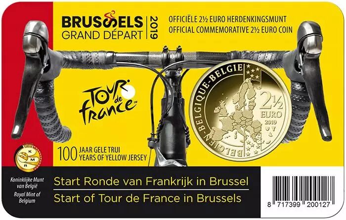 That's why the Royal Mint of Belgium has decided to dedicate a ?25 coin to the Grand Départ of the Tour de France. Designed by Luc Luycx, the creator of the common face of the euros, this coin is made of brass. It was minted in 120,000 copies, weighs 105g and has a diameter of 25.65 mm. In BU (Brillant Universel) quality, it is offered under coincard. It exists in 2 versions, one Flemish and the other Walloon.