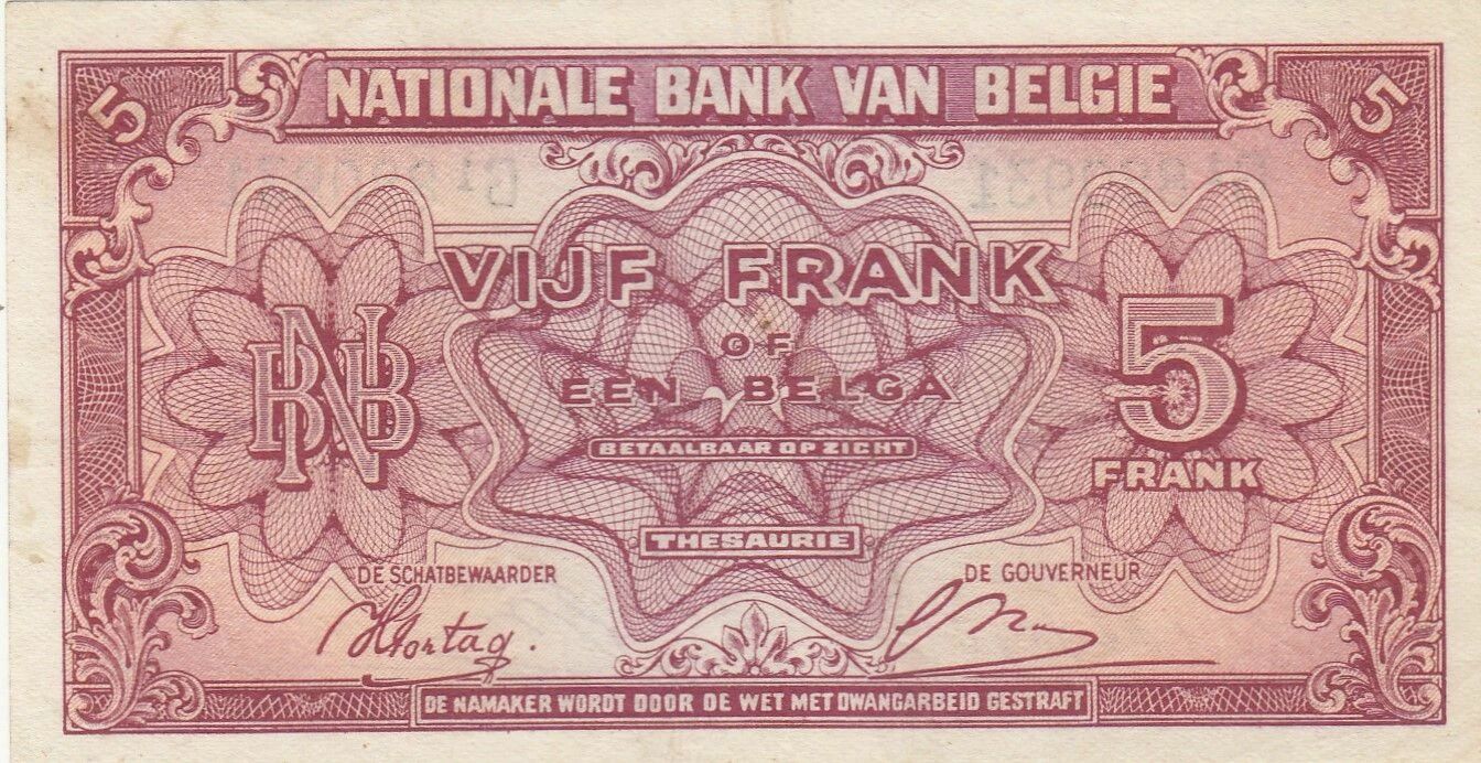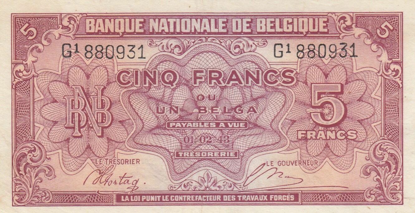 This Belgian banknote was issued in 1943. It has a face value of 5 francs. The dominant color of this banknote is red. It belongs to the G1 series.