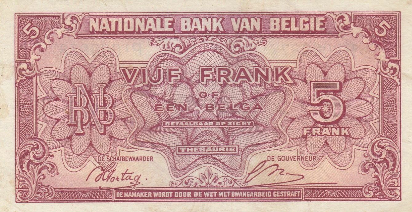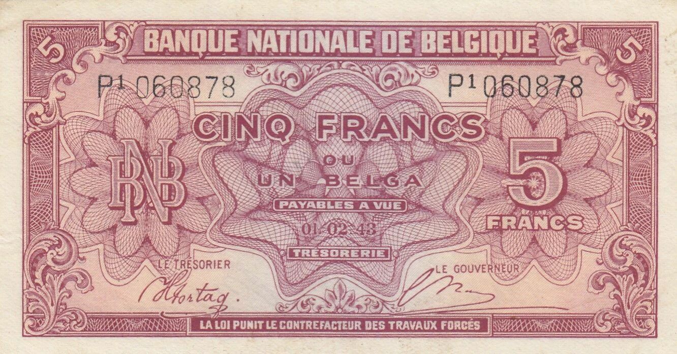 This banknote from Belgium was issued in 1943. It has a face value of 5 francs. The front of the banknote features a predominantly red background.