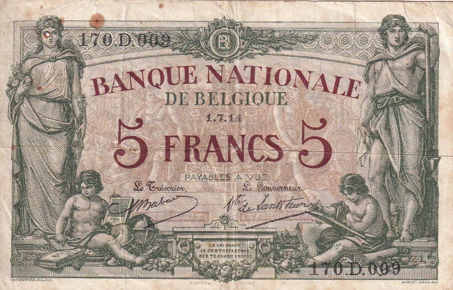 Banknote Belgium 5 Francs - Allegory - 01-07-1914 - Letter D - P.75