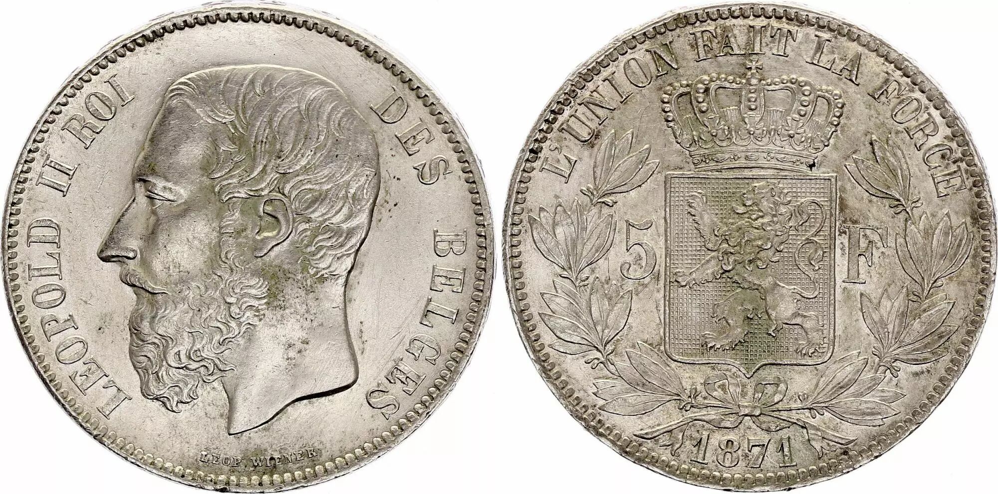 Coin Belgium 5 Francs, Leopold II - 1871