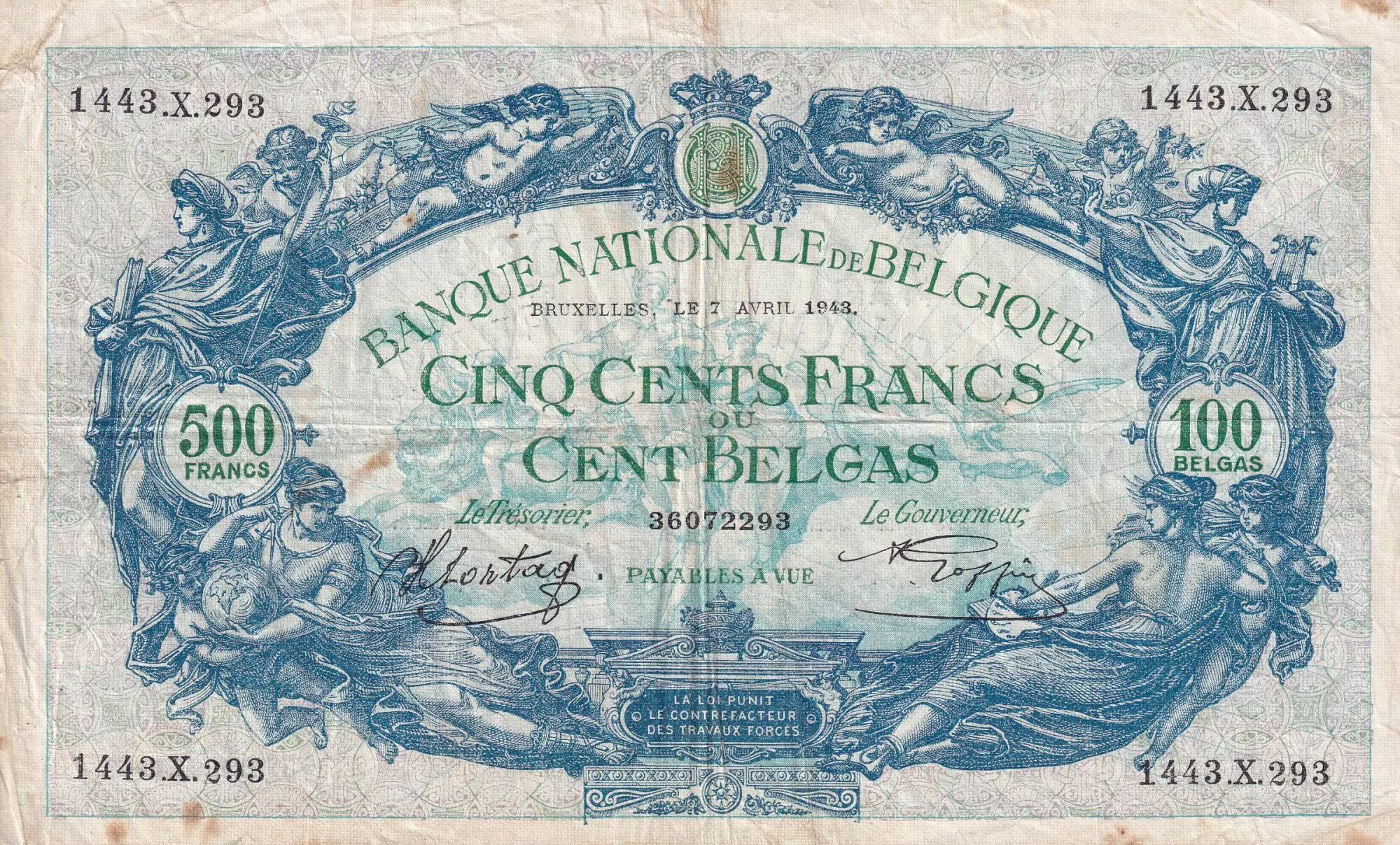 Home > > Belgium 500 Francs - Blue - 07-04-1943 - Letter X - F to VF - P.109