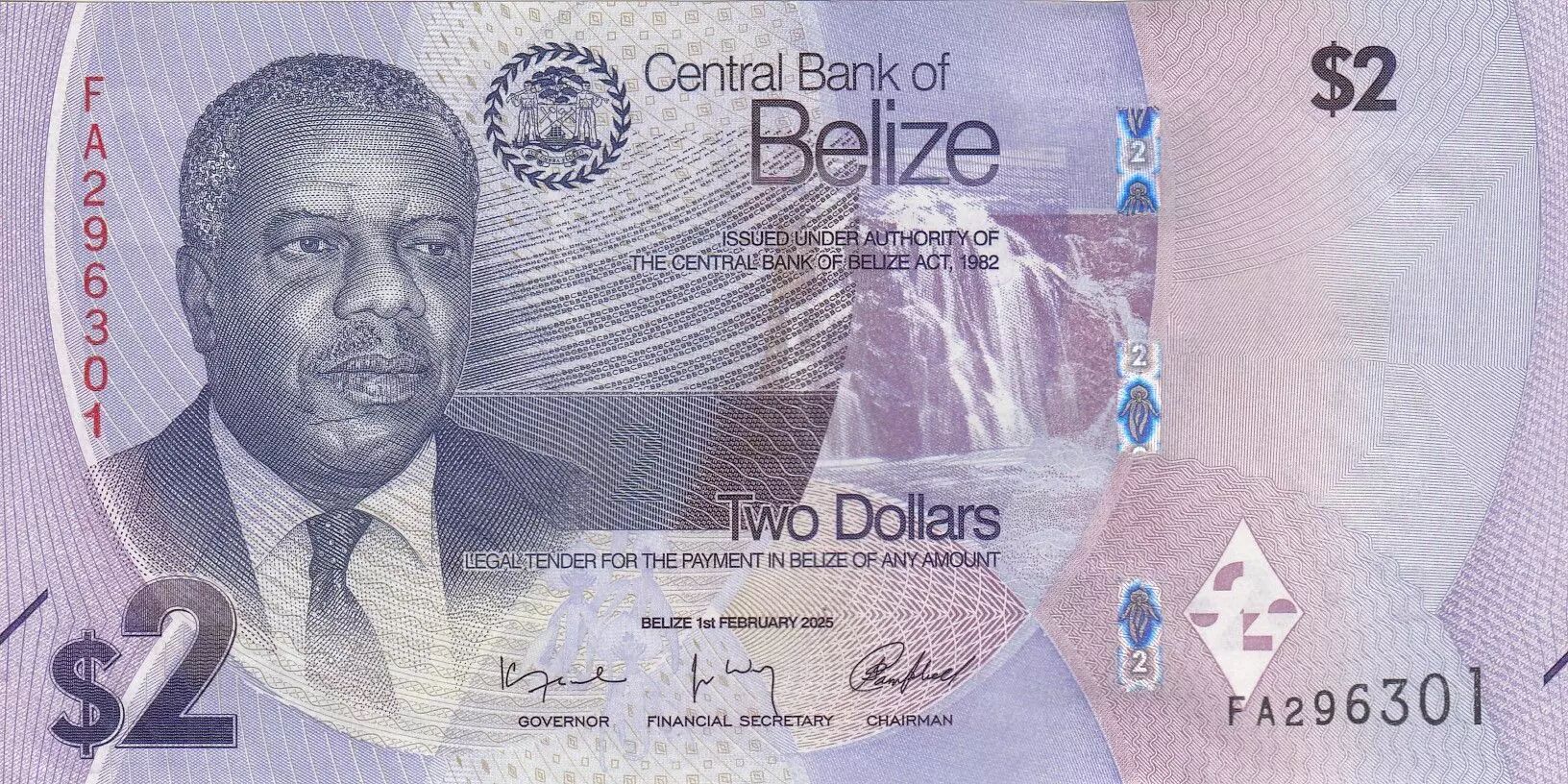 This banknote, with a face value of two dollars, is issued by the Central Bank of Belize in 2025. It belongs to series A.296 and measures 140 millimeters in length and 70 millimeters in width.