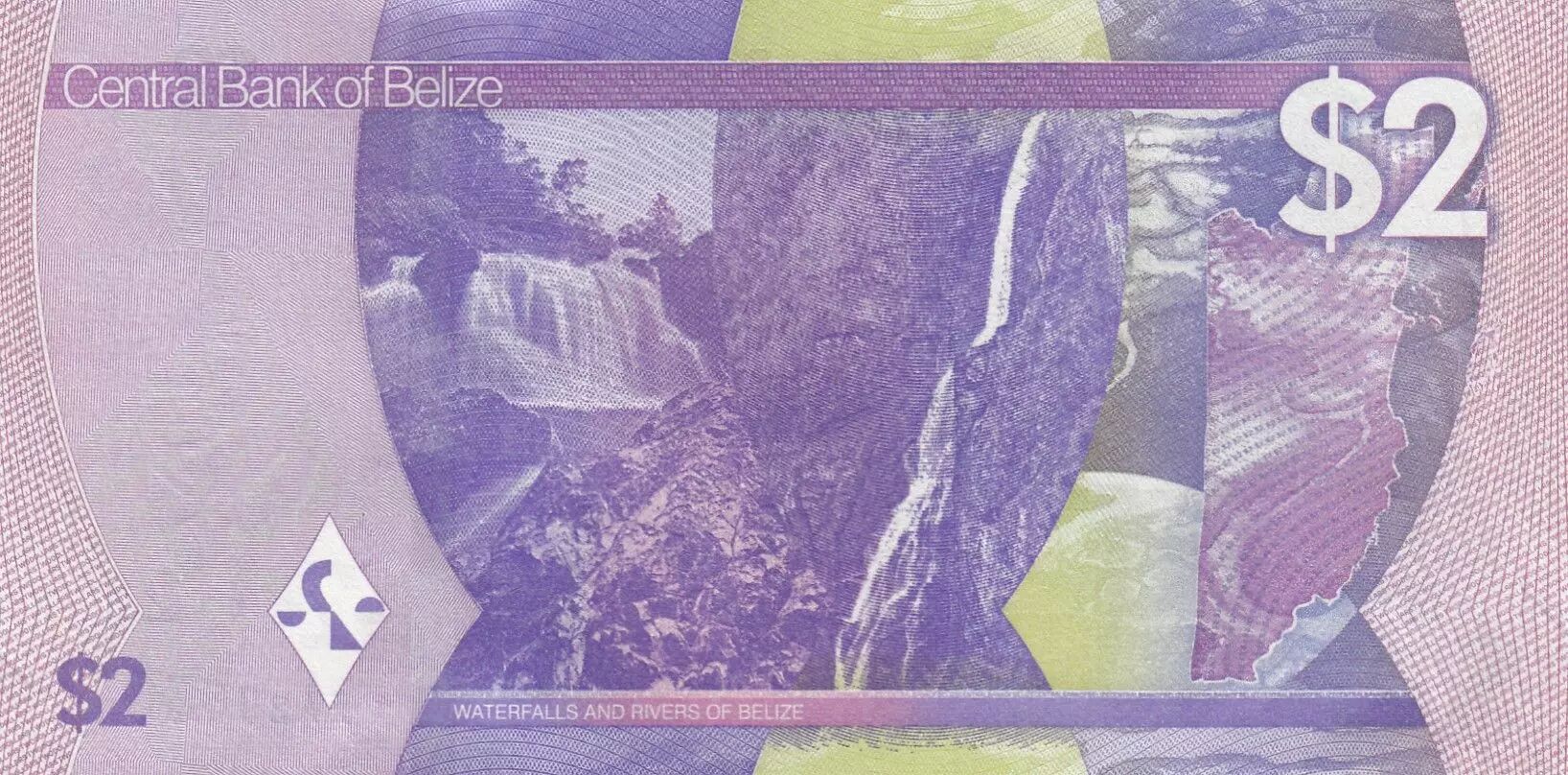 The back of the note, also violet with multicolored underprints, features inscriptions in English and the face value serving as a registration device. It depicts Sapodilla Falls in Elijio Panti National Park, as well as the 1,000-foot falls in Cayo. A PureImage windowed holographic security thread, adorned with a black orchid (Prosthechea cochleata), is integrated.