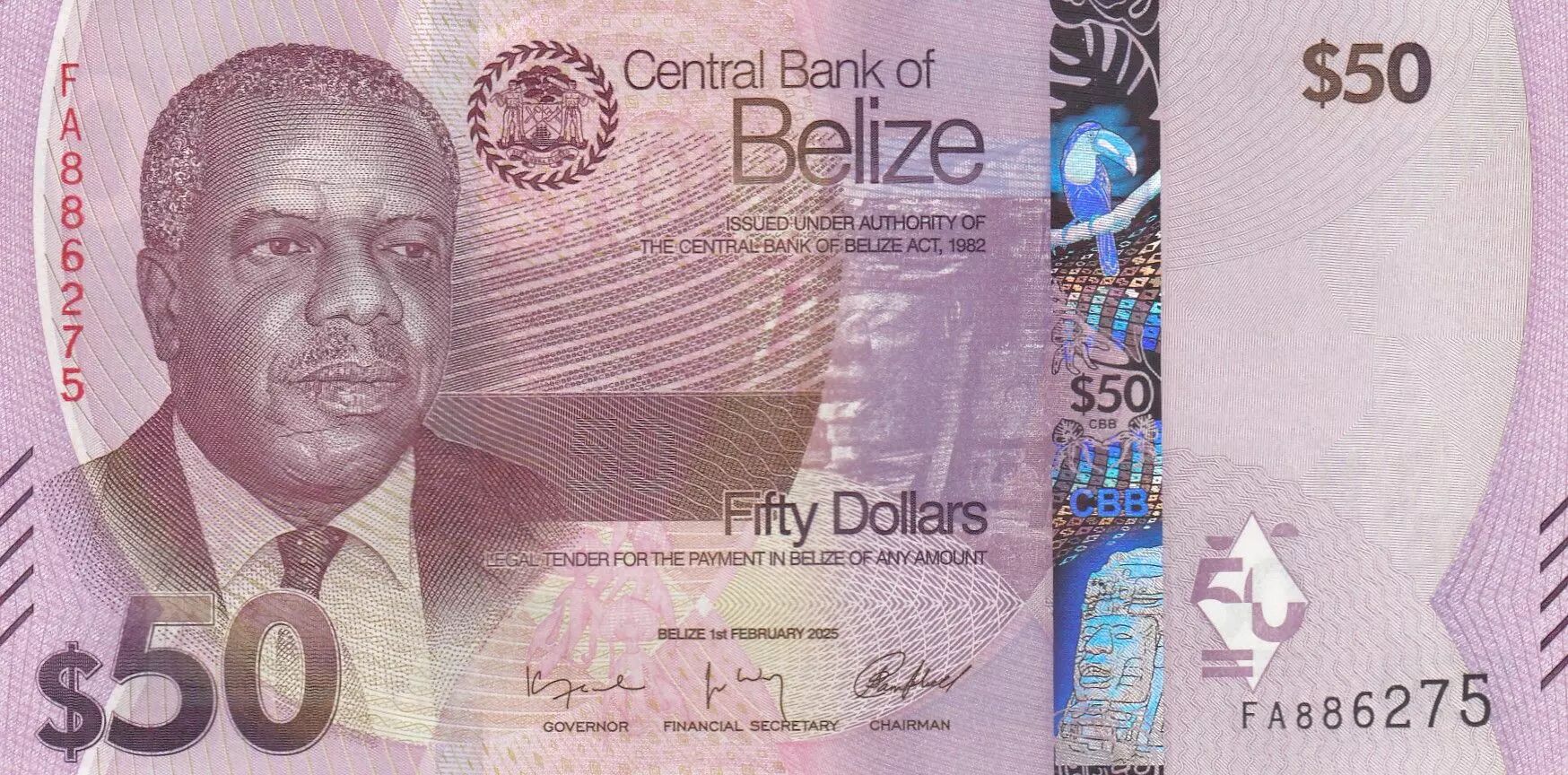 The 50 Belize dollar note, issued in 2025, is part of a commemorative series called "FA". This banknote, measuring 140 mm in length and 70 mm in width, features a design rich in symbols and references to Belize's history and culture.