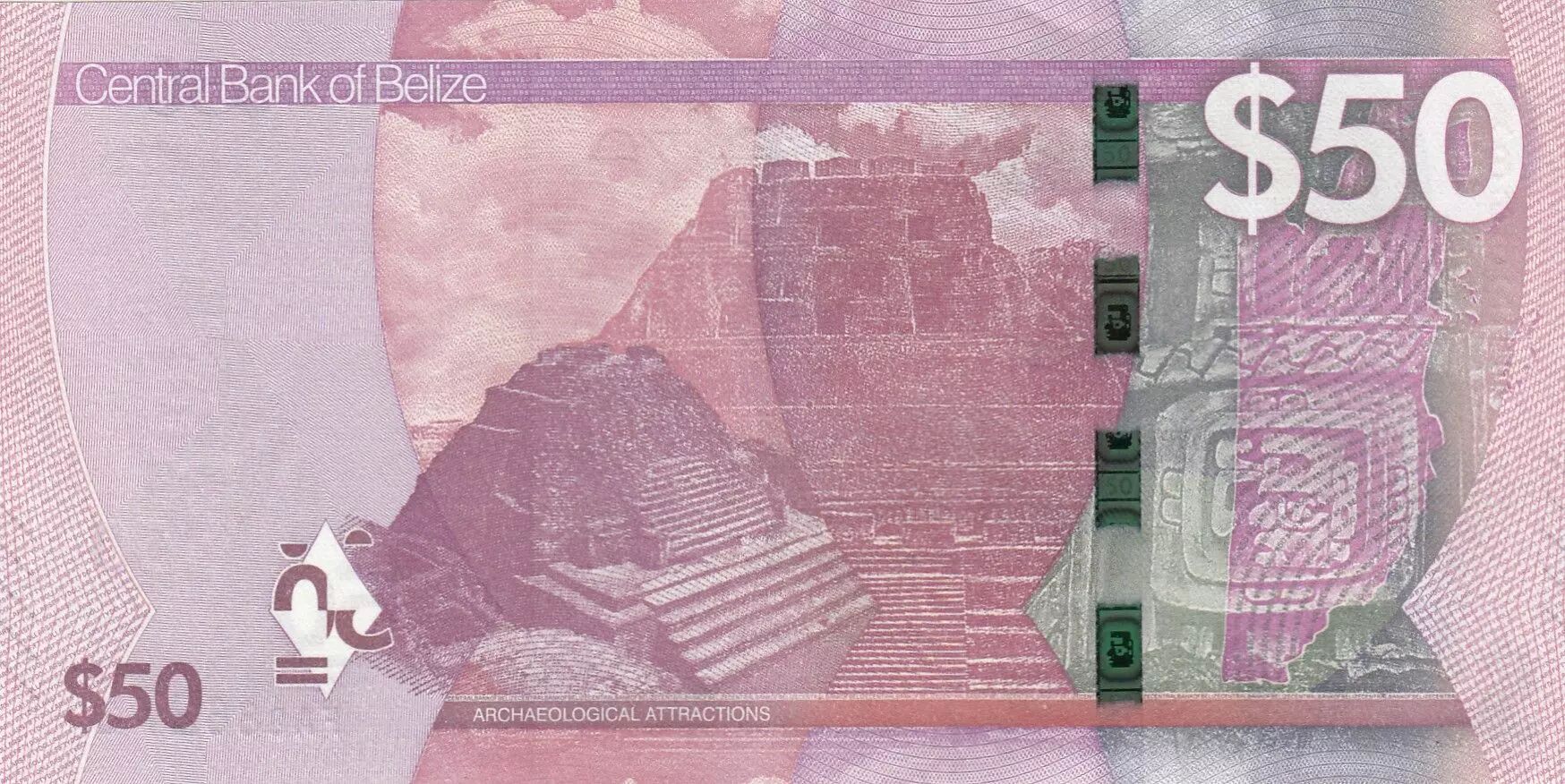 The back of the note, also in burgundy with multicolored underprints, highlights major archaeological sites in Belize. It features the summit of the Mayan ruins of Caana at Caracol, as well as the Mayan ruins of El Castillo at Xunantunich. A segment of the east frieze of Xunantunich is also depicted, emphasizing the importance of the country's Mayan heritage. A holographic stripe is integrated, displaying a keel-billed toucan and the Temple of the Masks at Lamanai, adding a visually distinctive security element. A windowed security thread is also present, reinforcing protection against counterfeiting.