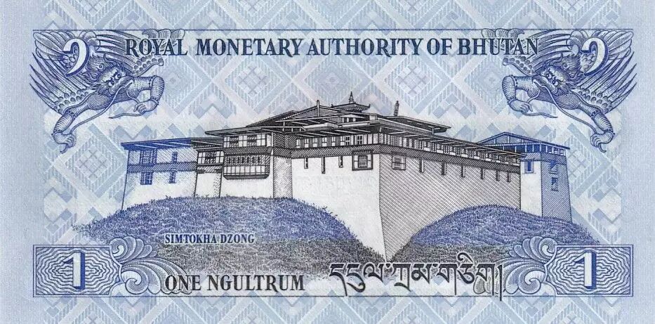 Le verso du billet représente le palais de Simtokha Dzong, situé au centre. L'inscription "ROYAL MONETARY AUTHORITY BHUTAN" figure également au verso, ainsi que la valeur "ONE NGULTRUM". L'écriture est en tibétain.