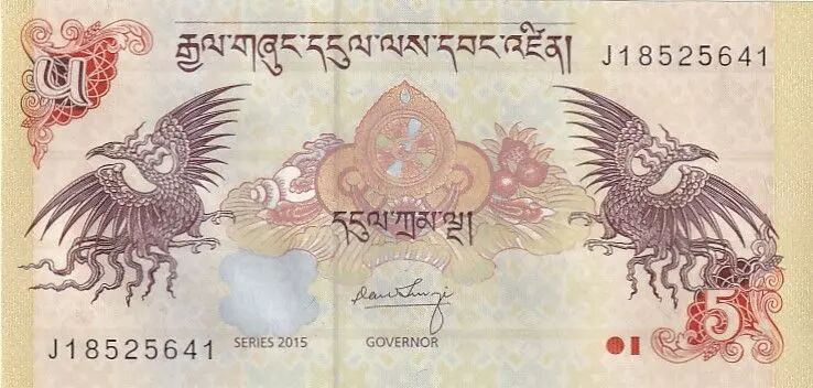 Ce billet de banque du Bhoutan, d'une valeur nominale de 5 ngultrum, a été émis en 2015 et fait partie de la série J. Il mesure 125 mm de long et 60 mm de large.