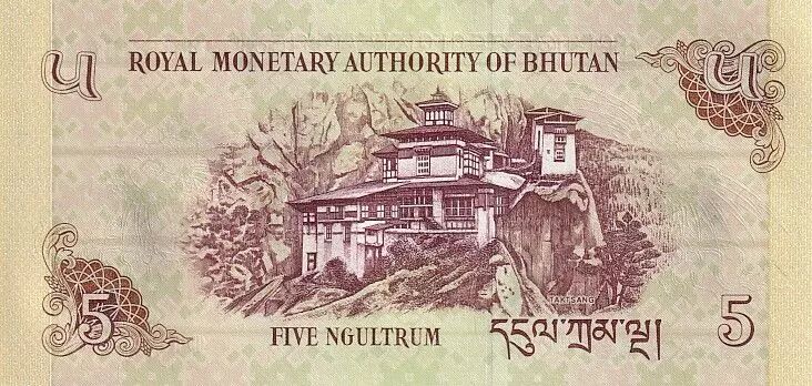 Les inscriptions sur le billet sont rédigées en latin et en tibétain. On peut lire "ROYAL MONETARY AUTHORITY OF BHUTAN" et "FIVE NGULTRUM". Le monastère de Taktsang, perché à flanc de falaise, est un lieu de pèlerinage important et un symbole de la spiritualité bouddhiste dans la région himalayenne.