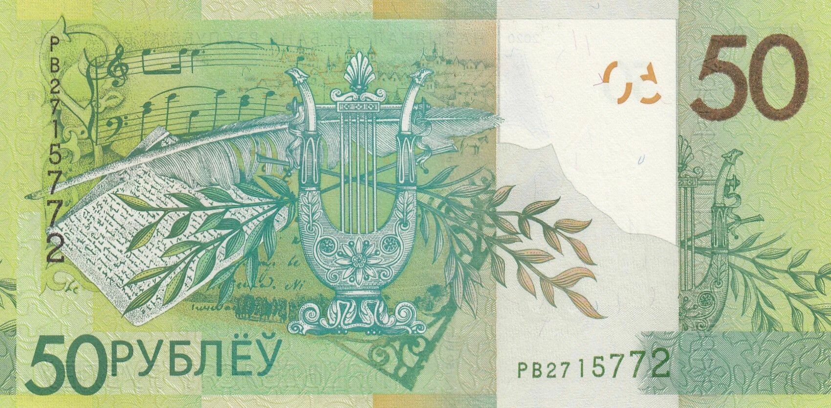 Au verso, on retrouve des motifs et des éléments graphiques qui complètent le design général du billet. Ces éléments peuvent inclure des ornements traditionnels biélorusses, des symboles nationaux ou d'autres représentations visuelles liées à l'identité du pays.