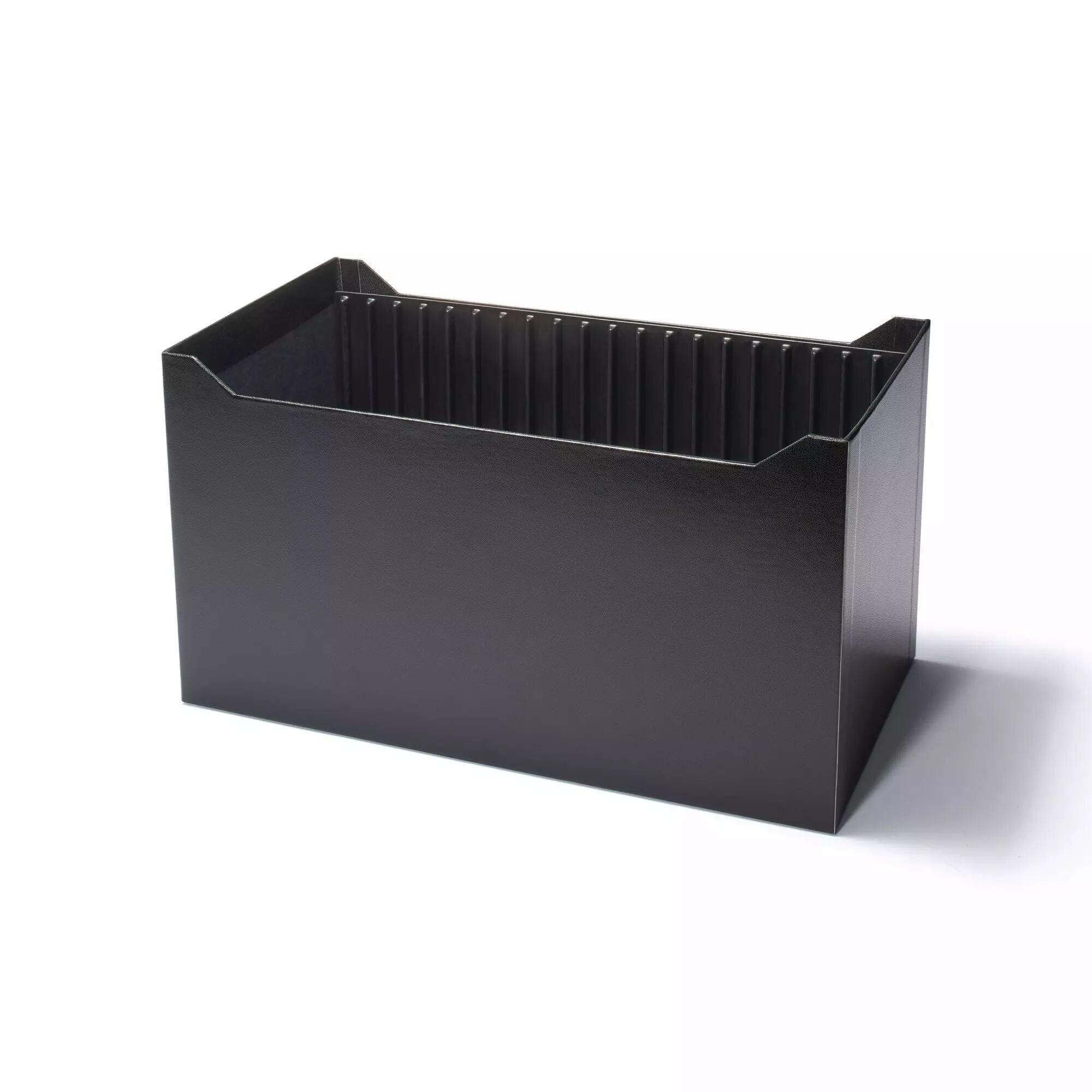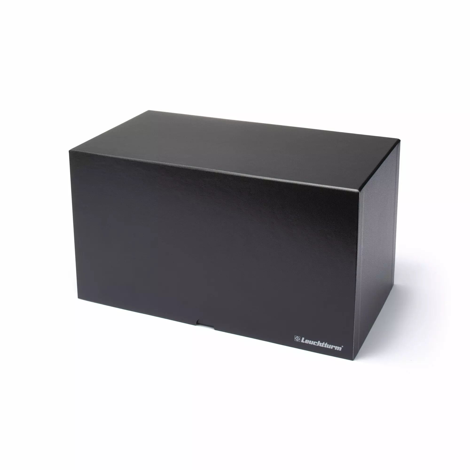 Boîte de rangement noire pour jusqu'à 20 blisters 154 x 154 mm. Barrettes intérieures pour un tri optimal. Pour un stockage à l'abri de la poussière.
