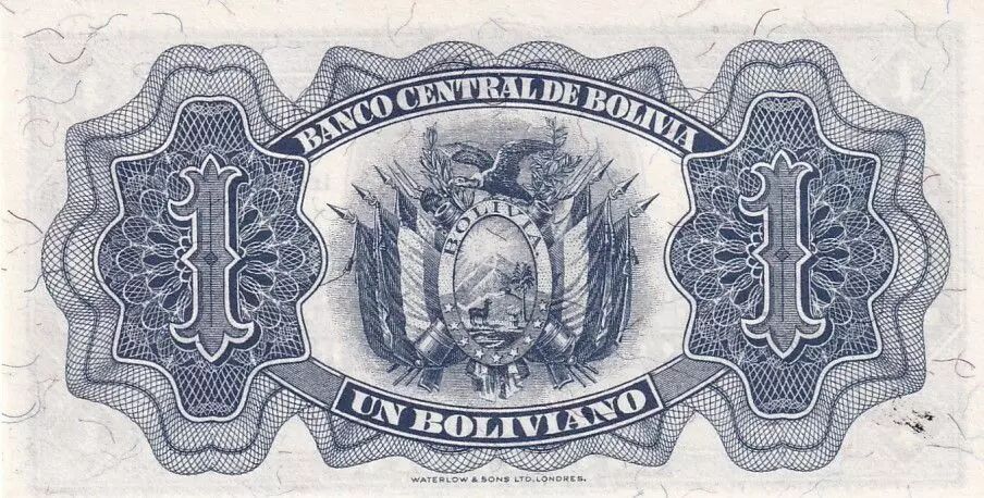 The reverse of the banknote is printed in blue tones. The national emblem of Bolivia occupies the center of the banknote, flanked by the value "UN BOLIVIANO" on either side. The mention "BANCO CENTRAL DE BOLIVIA" is also present. The name of the printer, "WATERLOW & SONS LTD., LONDON", also appears on the reverse, identifying the British company responsible for printing this banknote.