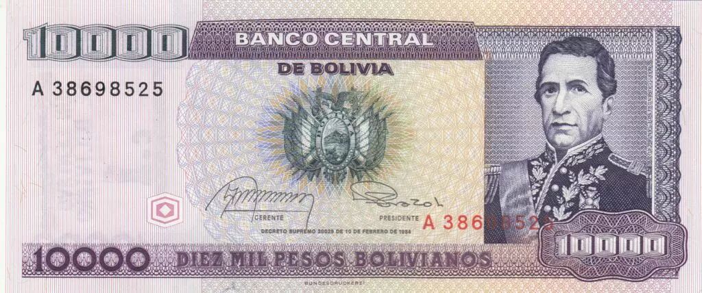 Banknote Bolivia 1 Centavo on 10000 Pesos Marechal De Santa Cruz - 1987