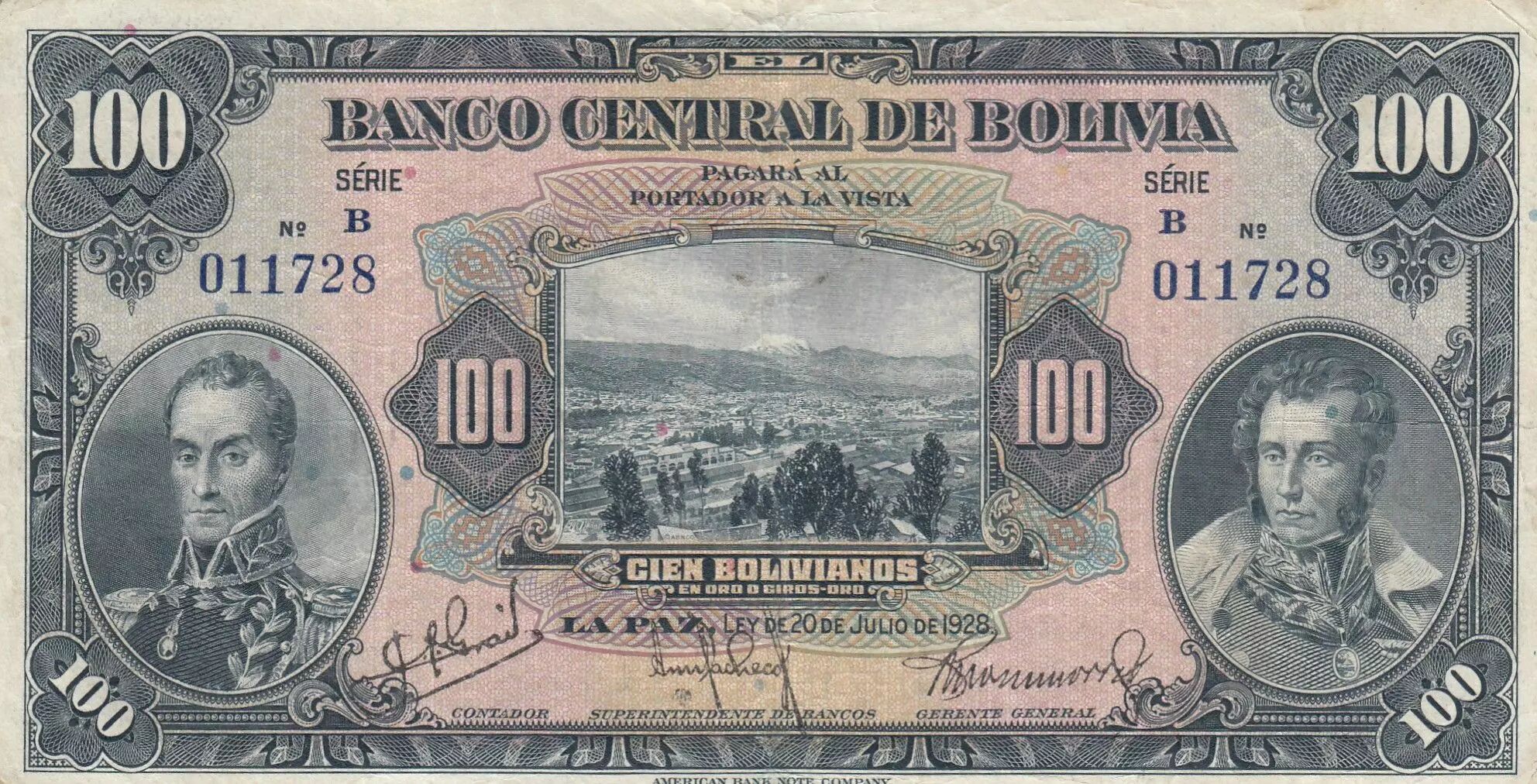 Banknote Bolivia 100 Bolivianos - S. Bolivar - J. de Sucre - 20-07-1928 - Serial B