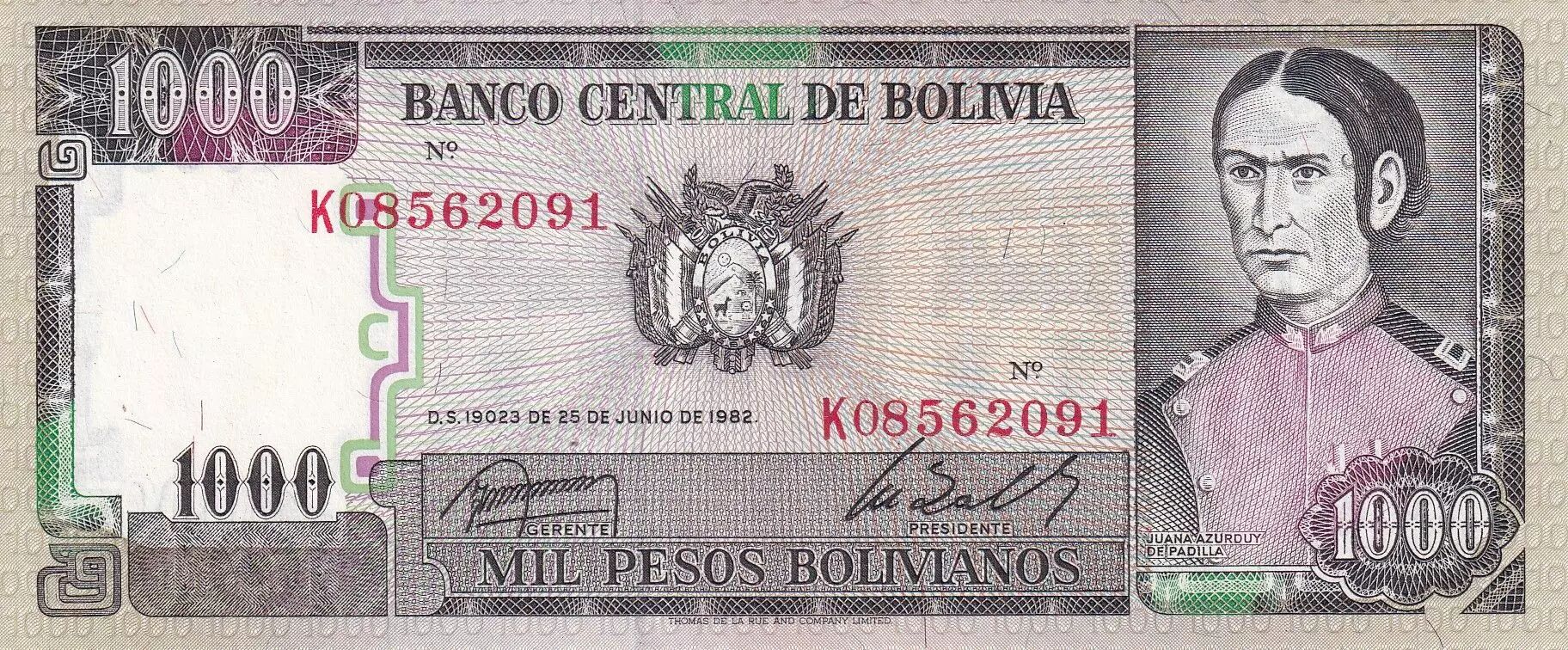 Home > > Bolivia 1000 Pesos Bolivianos - Juana De Padilla - House of liberty - 1982 - Serial K - P.167