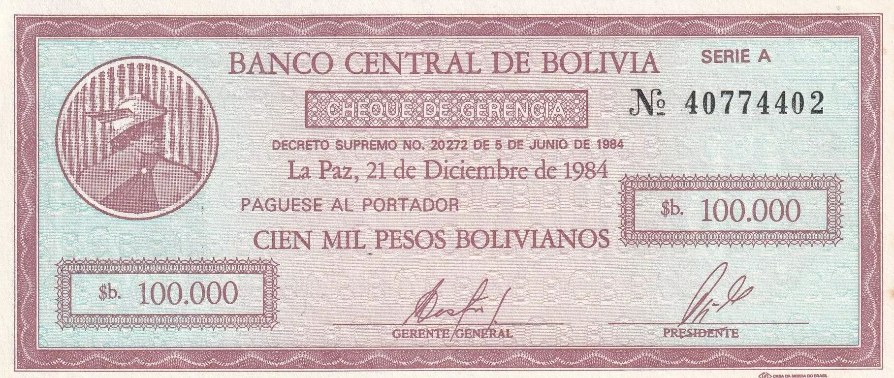 Home > > Bolivia 100000 Pesos Bolivianos - Mercury - 1984 - Serial A - P.188