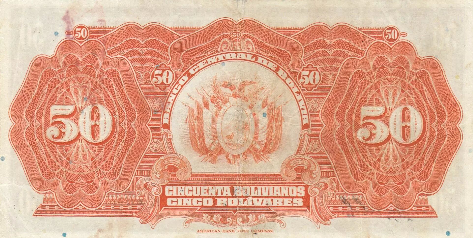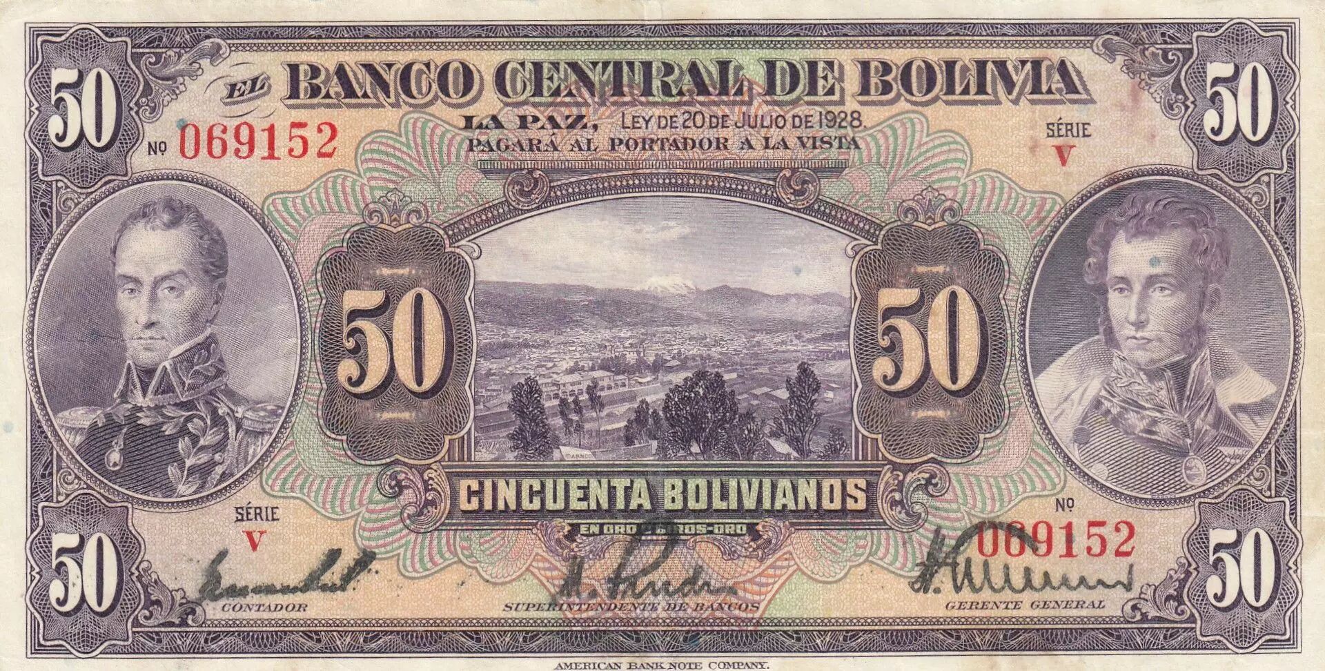 Banknote Bolivia 50 Bolivianos - S. Bolivar - J. de Sucre - 20-07-1928 - Serial V