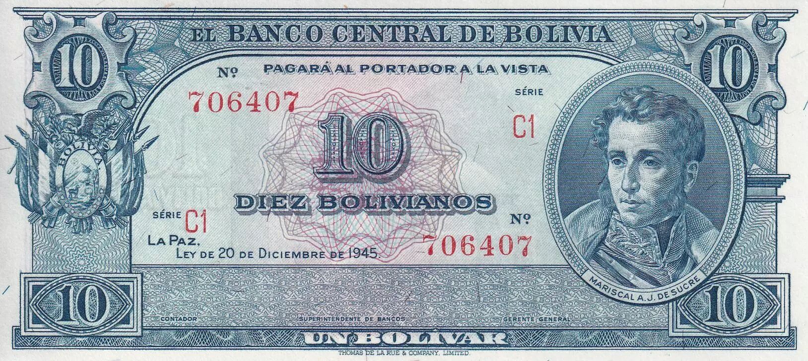 Billet Bolivie 10 Bolivianos - Mariscal A. J. De Sucre - 1945 - Série C.1 - P.139d
