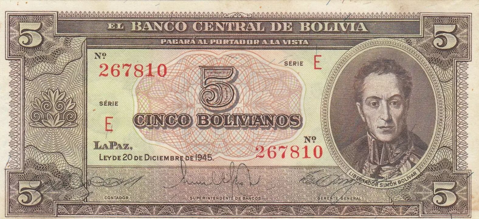 Ce billet de 5 bolivianos de 1945, série E, est un témoin de l'histoire monétaire bolivienne. Il illustre une époque et met en avant des symboles nationaux importants, tout en honorant la mémoire de Simón Bolívar.