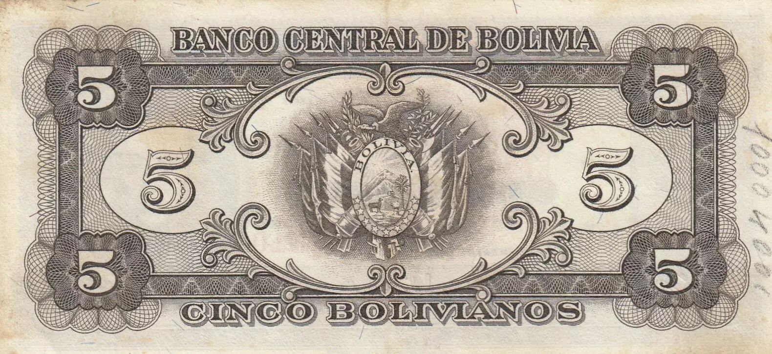 Le verso du billet arbore une couleur marron sur un fond rose clair. Les armoiries de la Bolivie sont positionnées au centre de cette face. Ces armoiries constituent un symbole national fort, représentant l'identité et la souveraineté du pays.