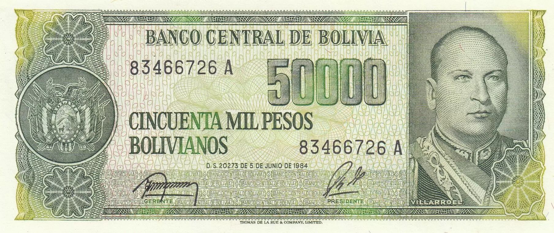 Le billet de 50000 bolivianos, émis en Bolivie en 1984, présente une couleur dominante verte sur un fond multicolore. Sur le recto, on trouve un portrait de Gualberto Villarroel sur la droite, accompagné des armoiries nationales boliviennes sur la gauche. L'inscription "BANCO CENTRAL DE BOLIVIA" figure en haut, suivie de la valeur nominale "50000" et de sa transcription littérale "CINCUENTA MIL PESOS BOLIVIANOS". La référence légale "D.S. 20273 DE 5 DE JUNIO DE 1984" est également imprimée.