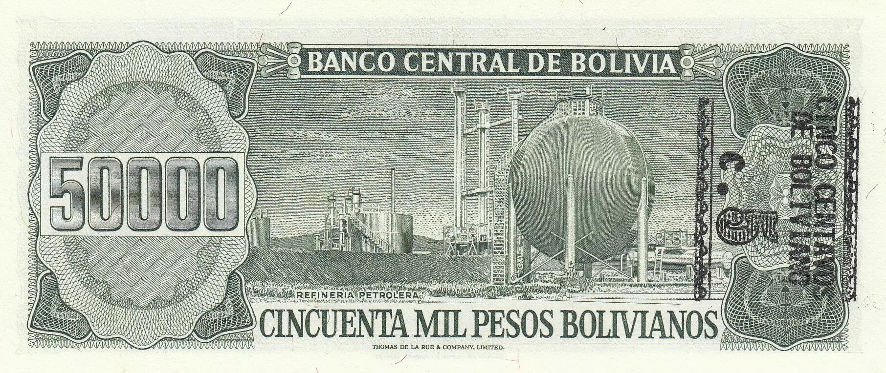 Le verso du billet, imprimé en vert, représente une raffinerie de pétrole en son centre. On y retrouve également l'inscription "BANCO CENTRAL DE BOLIVIA" en haut, suivie de la valeur nominale "50000" et de sa transcription littérale "CINCUENTA MIL PESOS BOLIVIANOS". La légende "REFINERIA PETROLERA" identifie le sujet principal de l'illustration.