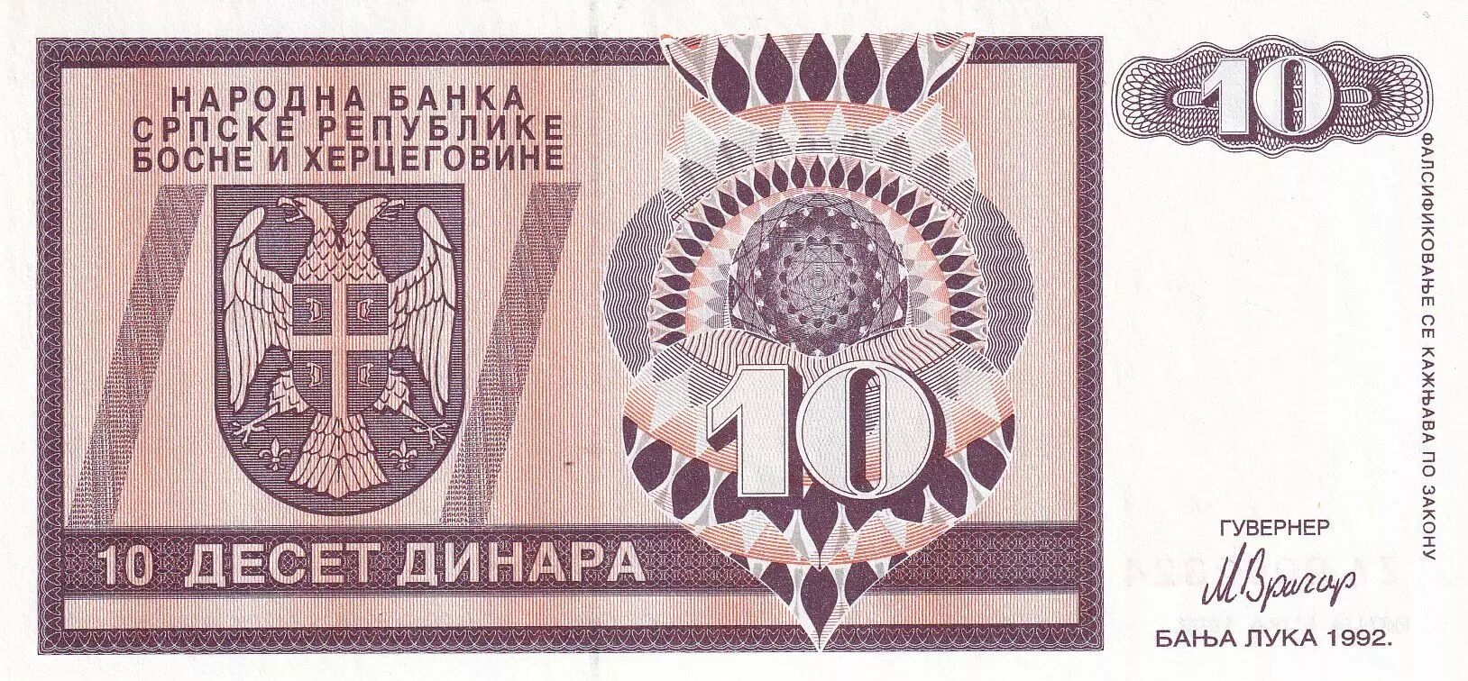 Banknote Bosnia-Herzegovina 10 Dinara - Eagle with 2 heads - 1992 - Serial ZA (replacement) - P.133r