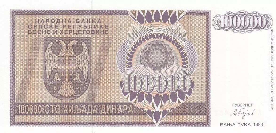 Banknote Bosnia-Herzegovina 100000 Dinara 1993 - Eagle with 2 heads - P.141 - UNC