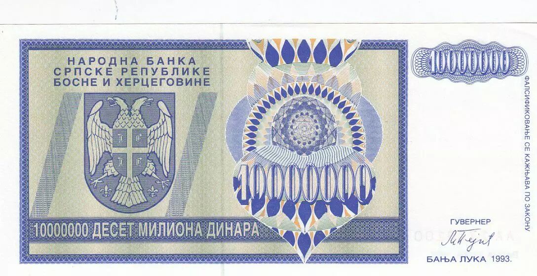 Banknote Bosnia-Herzegovina 10.000.000 Dinara 1993 - Eagle with 2 heads - P.144 - UNC