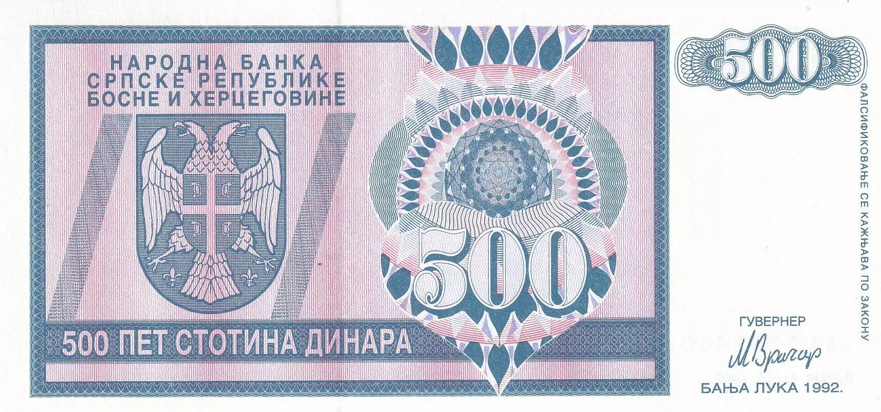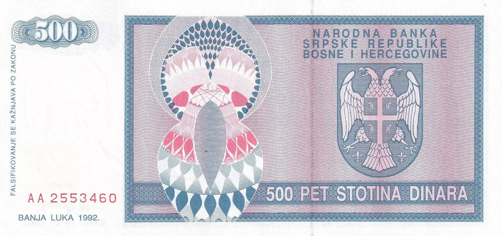 Banknote Bosnia-Herzegovina 500 Dinara - Eagle - 1992 - Serial AA - P.136