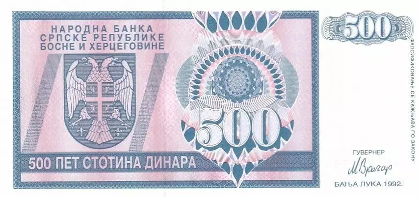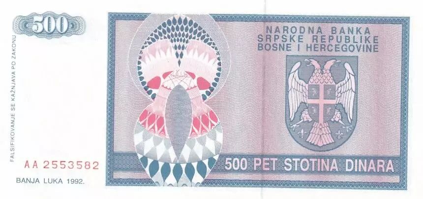 Home > World Banknotes > European Banknotes > Bosnia and Herzegovina > Bosnia-Herzegovina 500 Dinara - Eagle with 2 heads - 1992 - Serial AA