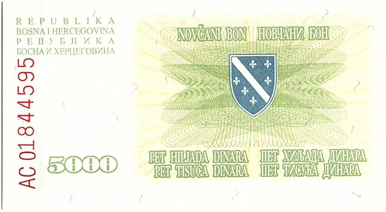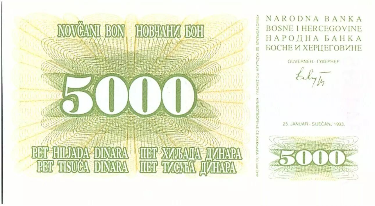 Banknote Bosnia-Herzegovina 5000 Dinara Green and yello - 1994 - Reduced size