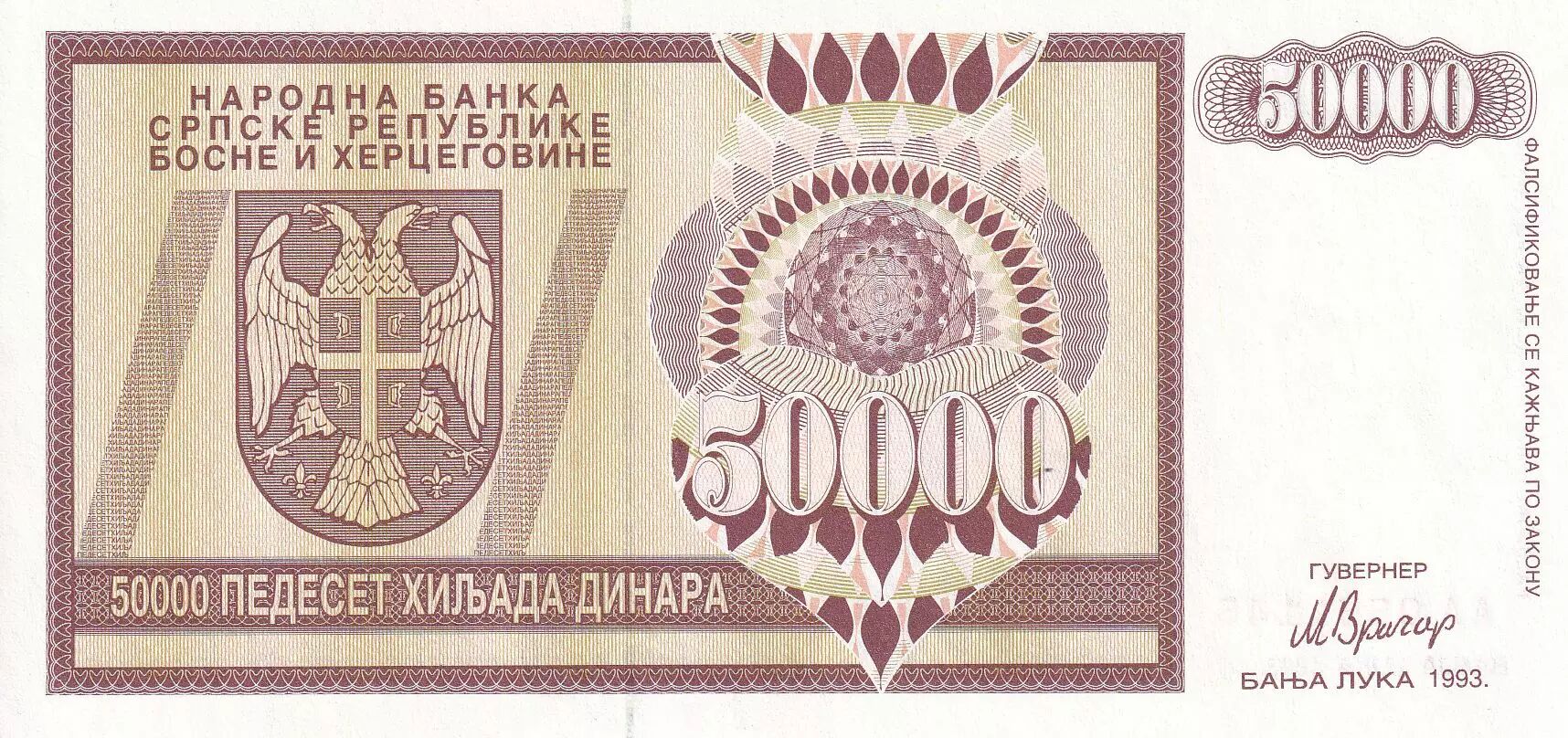 Banknote Bosnia-Herzegovina 50000 Dinara - Eagle with 2 heads - 1993 - UNC- P.143