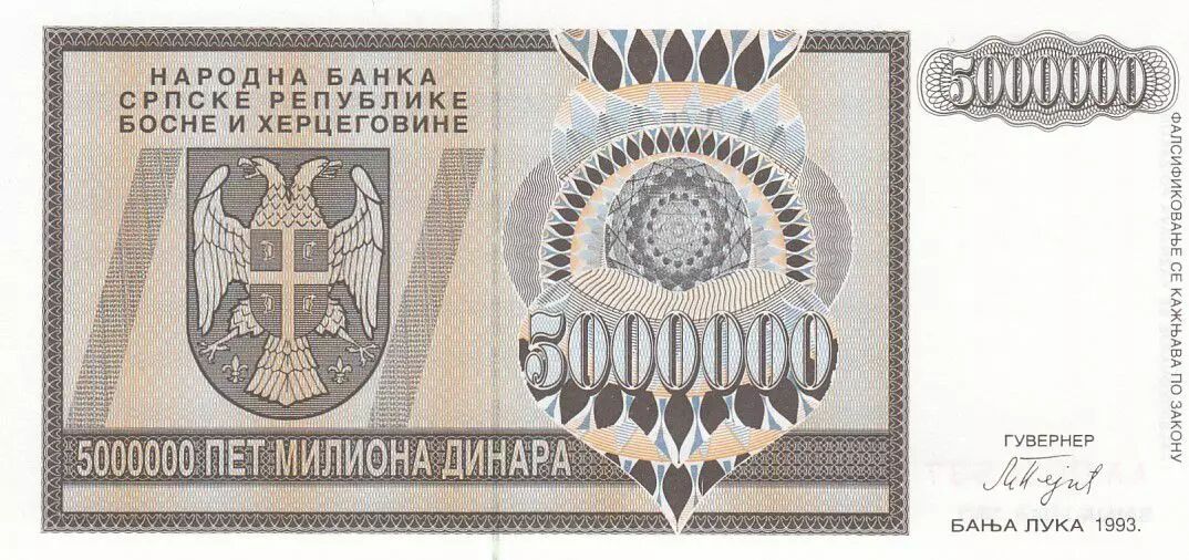 Banknote Bosnia-Herzegovina 5000000 Dinara 1993 - Eagle with 2 heads - P.143 - UNC