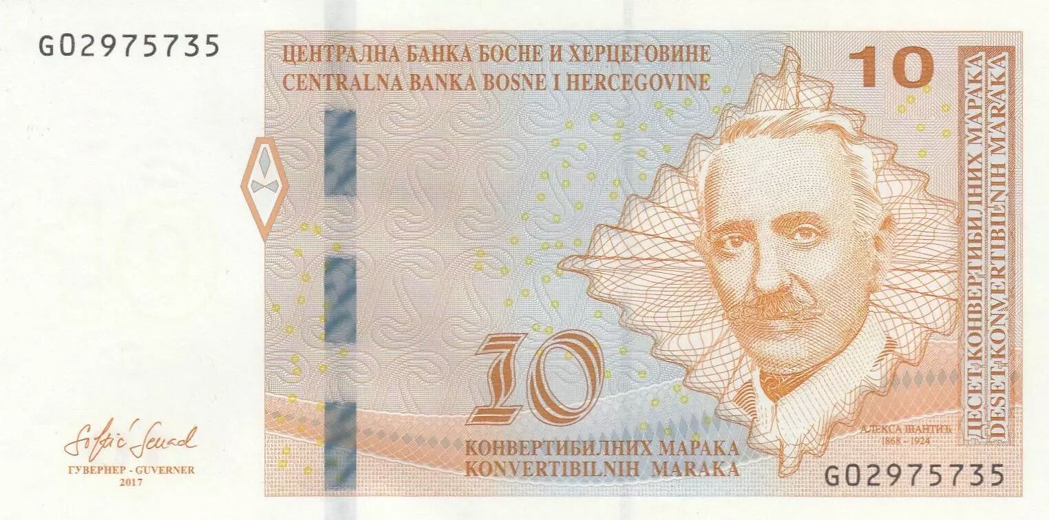 Le recto du billet met en valeur le portrait d'Aleksa ?anti? (1868-1924), figure culturelle dont les dates de naissance et de décès sont mentionnées sous son effigie. Les inscriptions incluent le nom de la banque émettrice en plusieurs langues : "BANQUE CENTRALE DE BOSNIE-HERZÉGOVINE". La valeur nominale, "10", est répétée à plusieurs endroits, accompagnée de la devise "MARAKAS CONVERTIBLES". On y trouve également la désignation de la valeur en toutes lettres : "DIX MARAKAS CONVERTIBLES". Un motif décoratif représentant un pain complète la composition du recto.