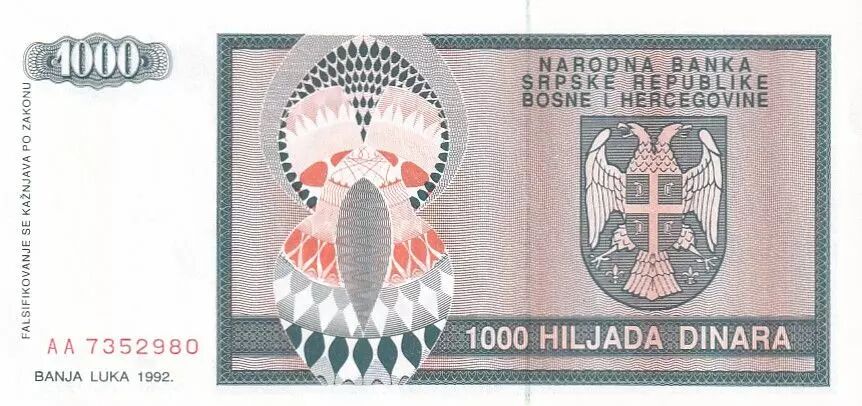 Accueil > Billets du Monde > Billets d'Europe > Bosnie-Herzégovine > Bosnie-Herzégovine 1000 Dinara 1992 - Aigle à 2 têtes - Série AA