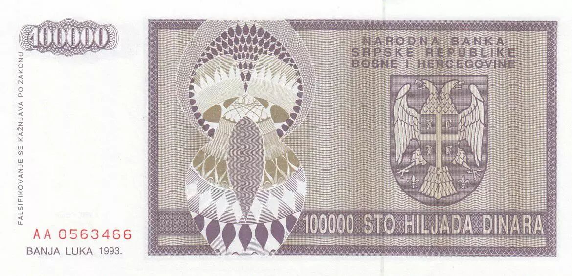 Billet Bosnie-Herzégovine 100000 Dinara 1993 - Aigle à 2 têtes - P.141- Neuf