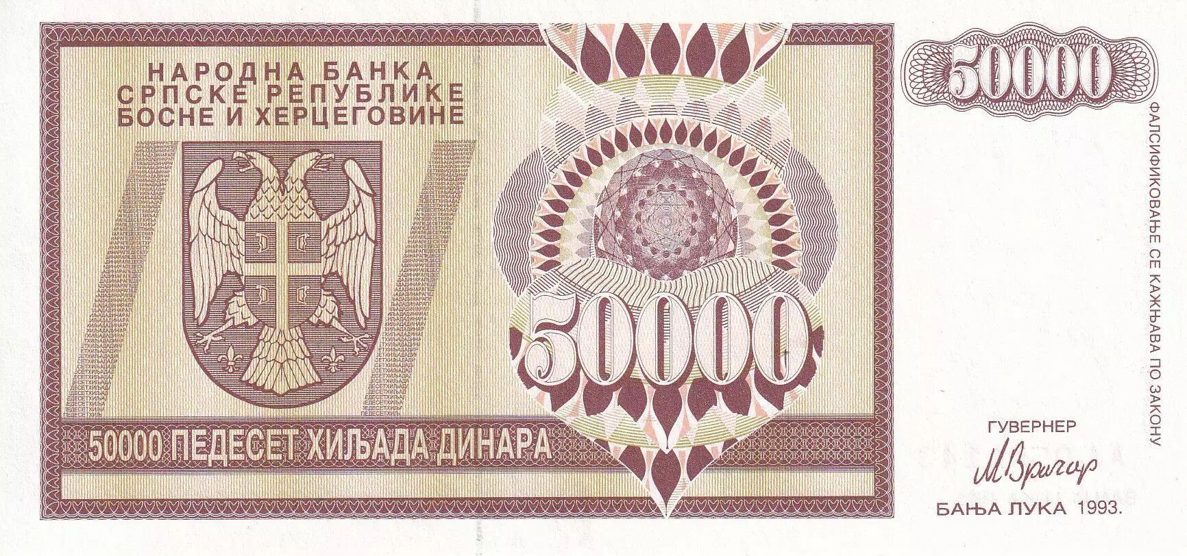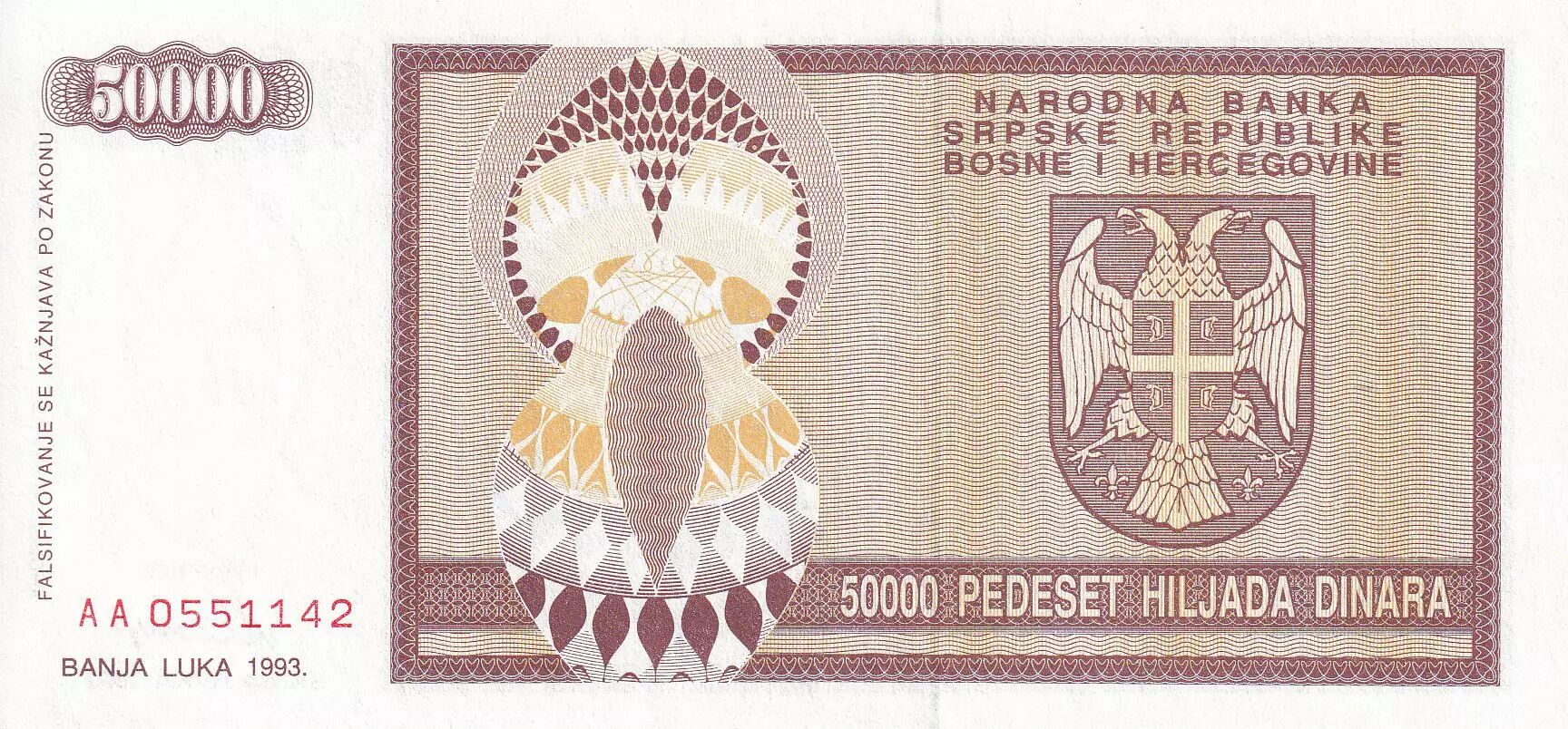 Billet Bosnie-Herzégovine 50000 Dinara - Aigle à 2 têtes - 1993 - NEUF - P.143