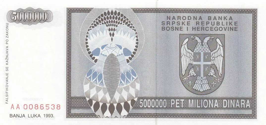 Billet Bosnie-Herzégovine 5000000 Dinara 1993 - Aigle à 2 têtes - P.143- Neuf