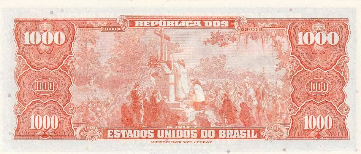 The back of the banknote features an orange hue obtained by chalcography. It reproduces the painting "Primeira missa no Brasil" by Victor Meirelles, dating from 1860, accompanied by the legend "PRIMEIRA MISSA". The label "REPUBLICA DOS / ESTADOS UNIDOS DO BRASIL" is also present. The dimensions of this banknote are 157 mm in length and 67 mm in width.